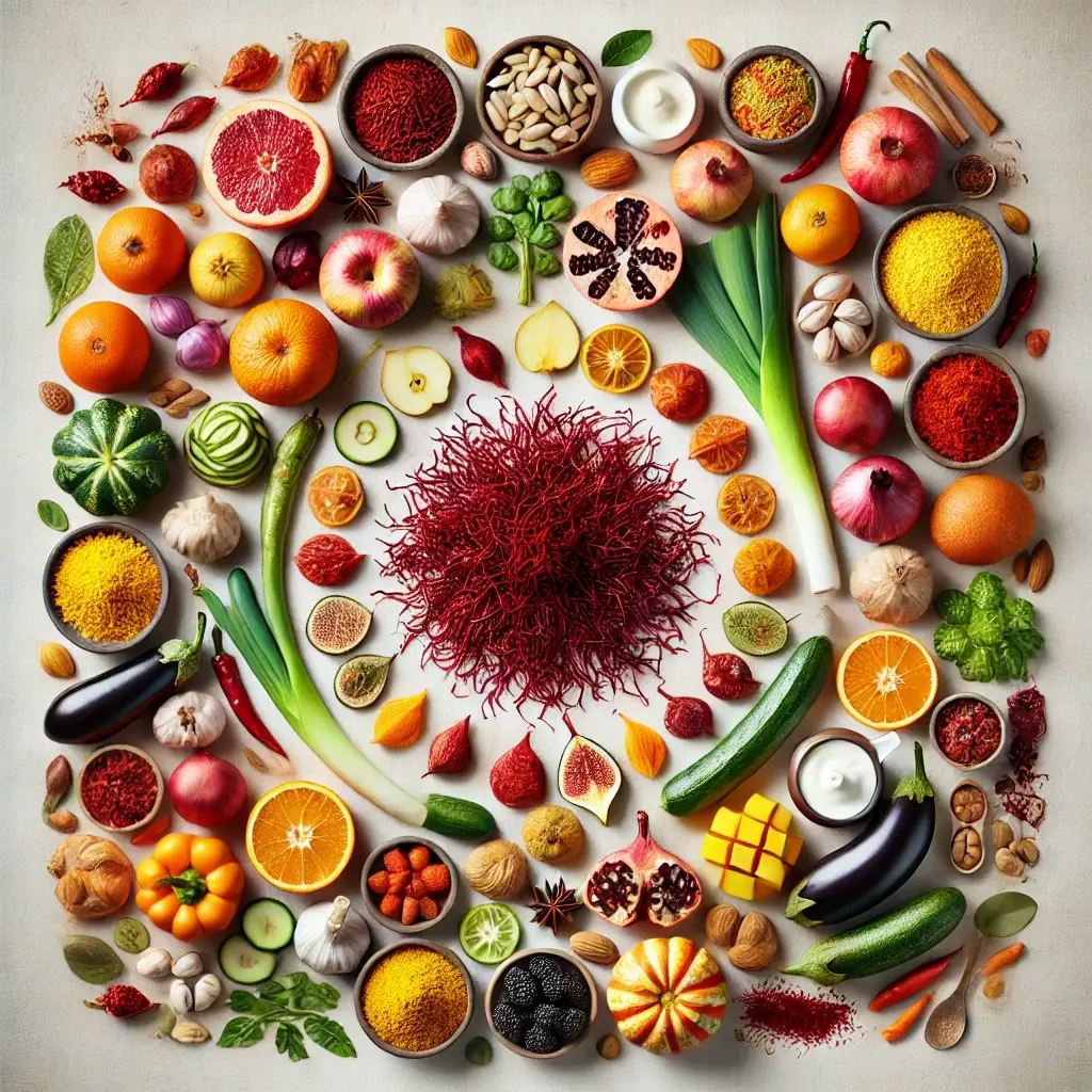 Citrus fruits such as orange, grapefruit, and lemon enhance its natural brightness, while warming spices like cinnamon, chili, and star anise deepen its complexity. Nuts, including pistachios and almonds, offer a rich, creamy contrast that complements saffron's earthy tones.